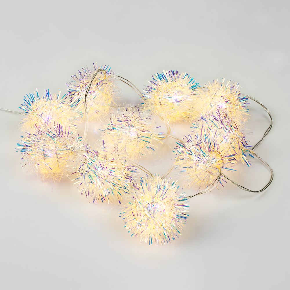 10 помпонов с мишурой с лампочками теплого света. Работает от 2 батареек АА (в комплект не входят). -