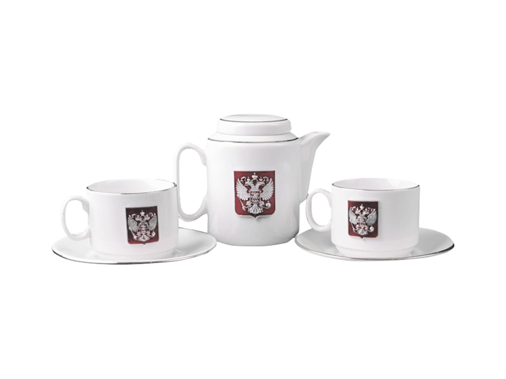Подарочный набор фарфоровый с чайником Россия. Фарфоровый чайник и две фарфоровые чайные пары с серебрянной отводкой края чашки и блюца декорированная металлическим барельефом Двуглавый орел. Материал барельефа сплав алюминия с декоративным покрытием под серебро и отделкой эмалью. Емкость чашек 220 мл., ёмкость чайника 500 мл. Ручная работа. Шильд спектрум (Шильд спектрум) на данный товар осуществляется бесплатно. Оплачивается только настройка оборудования в размере 1100 рублей на весь тираж.
