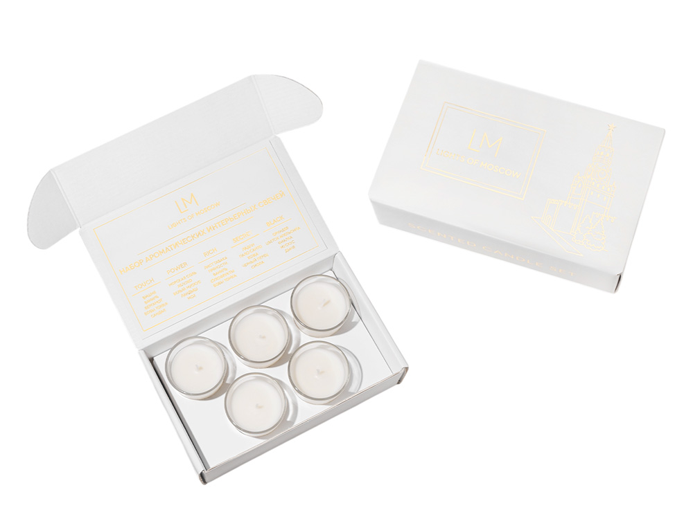 Подарочный набор ароматических свечей - это не только прекрасный, необычный подарок, но и отличный способ познакомиться брендом Lights of Moscow и его эксклюзивными ароматами. Scented candle set состоит из 5 ароматов со своей особенной историей, ассоциацией. Touch Притягательный и соблазнительный аромат во главе со спелой вишней, в которой контрастируют сладкие и терпкие, яркие и таинственные ноты. Красная и чарующая она пробуждает неутолимое желание и будоражит фантазию, завершая композицию незаметным шлейфом чувственных нот: бобами тонка, бергамота, ванили и сандалового дерева. Power Энергичная, но в то же время утонченная композиция, напоминающая морские брызги и дуновение ветра. Глубокие, акватические ноты постепенно раскрываются в тандеме с зелёным яблоком и белым мускусом. Бодрящий и свежий аромат завершается оттенками ландыша и мха, подчёркивая прохладу и романтику всей пирамиды нот. Secret Чувственная и романтическая орхидея - это цветок любви и красоты, олицетворяющий великолепие и совершенство. Женственная композиция дополнена оттенками цветка апельсина, который подчеркивает фруктовые акценты, а дополнение в качестве пленительных нот фиалки, мускуса и дыни придают особенную глубину композиции. Rich Это аромат роскоши, атмосфера светского мероприятия, проходящего в дорогом зале, где собрались леди и джентельмены. Листья табака имеют пряный и в тоже время свежий аромат, он прекрасно дружит с ванилью, усложняя композицию, делая её более дорогой и утонченной. В то время как сухофрукты и бобы тонка добавляют интригующей ноты аромату. Black Дымный и загадочный аромат с яркими нотами смолы и ладана ассоциируется с уверенностью и элегантностью. Восточно-древесная композиция дополнена восхитительным, интригующим шлейфом пало санто, кожи и чёрного перца. Комплектность: - Подарочная коробка с ложементом и брендированной лентой - 1 шт. - Свечи 5 шт.*50 мл. - Открытка - 1 шт. Условия хранения: — Свечи, аромасаше, аромадиффузоры, SPA-наборы следует хранить при температуре +18…+24 °C, вдали от источников тепла, сквозняков и прямых солнечных лучей. — Рекомендуемая влажность — не более 50%. — Избегайте длительного воздействия яркого света. Тампопечать (1 цвет (белые изделия)) на данный товар осуществляется бесплатно. Оплачивается только настройка оборудования в размере 4500 рублей на весь тираж.