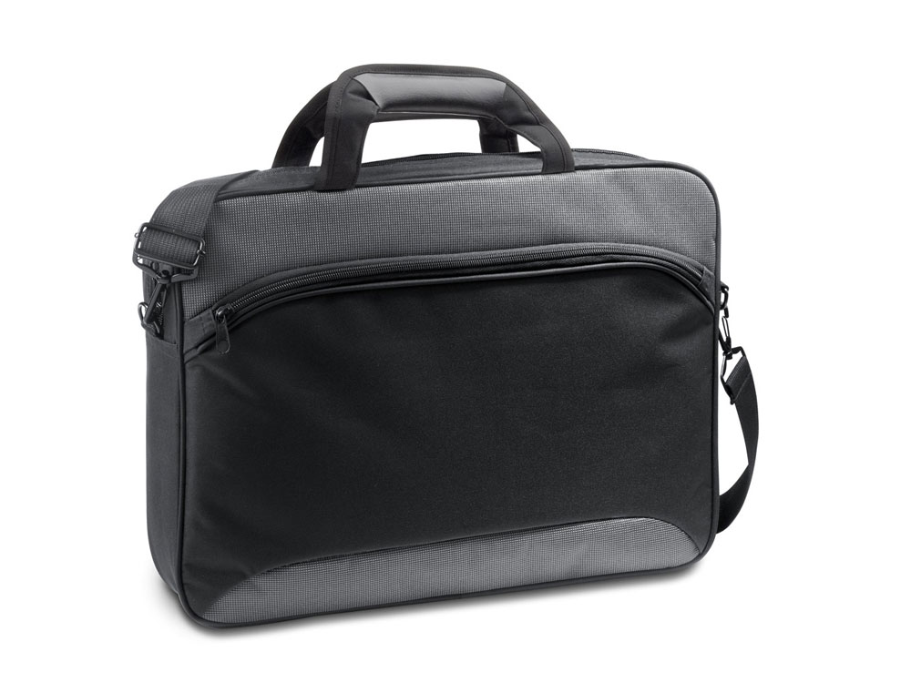 SANTANA. Сумка для ноутбука 15.6'', Серый. Сумка для ноутбука из полиэстера 600D2Tone и 300D с отделением с внутренней подкладкой и мягким отделением для ноутбука с диагональю до 15'6''. Передний карман с внутренними отделениями. Ремень для крепления к чемодану. Регулируемый плечевой ремень с мягкой подкладкой. Вид нанесения, рекомендуемый поставщиком: трансфер