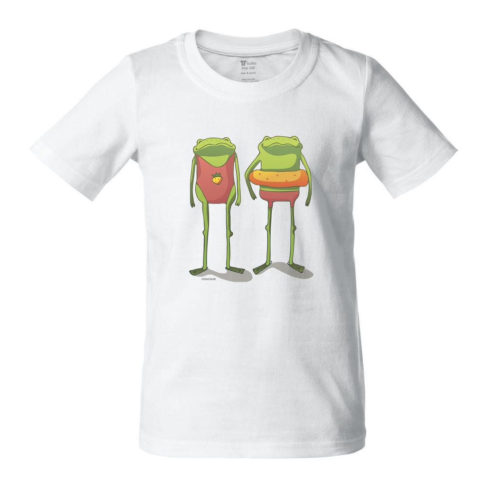 Футболка детская «Лягушата на пляже», белая оптом по цене 670 руб. Печать логотипа