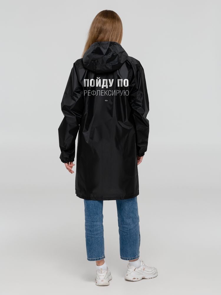 Дождевик-оберег для интеллектуалов с тонкой душевной организацией. Даже если вы уйдете в себя прямо посреди дороги, светоотражающий принт не позволит другим участникам движения потерять вас из виду.