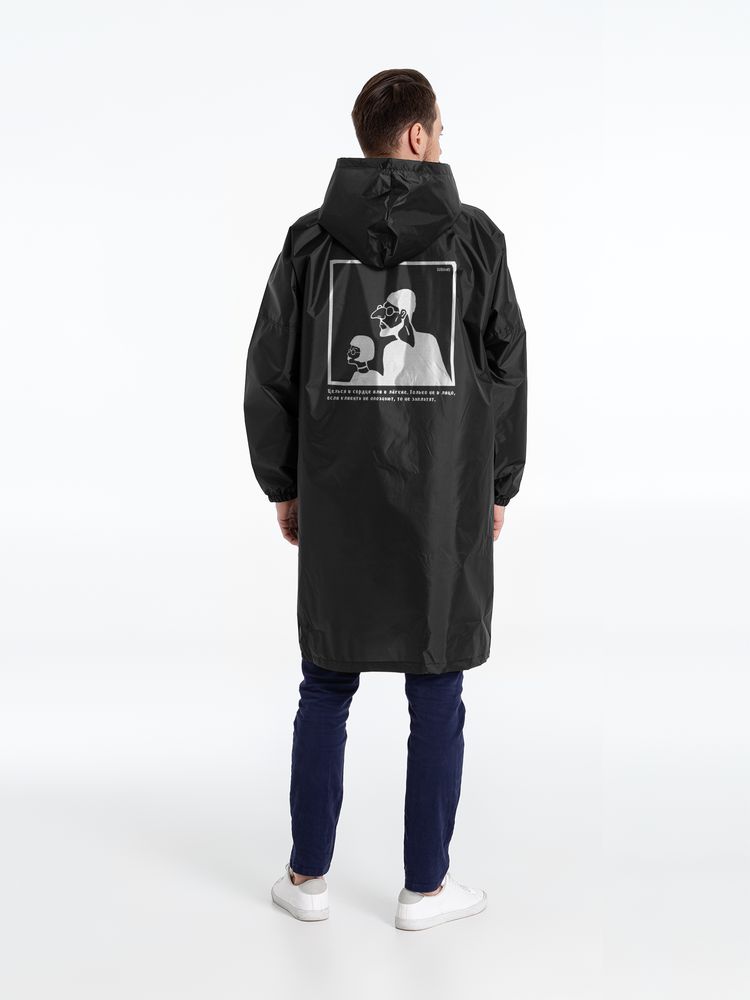 Дизайн принта: Яков Коган.Плащ-дождевик из ткани таффета на молнии с капюшоном. Складывается в мешочек — удобно брать с собой.- Удлиненная модель