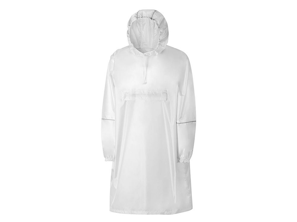 Дождевик - пончо прямого силуэта. Нагрудный карман плаща закрывается на молнию, которая дополнительно защищена клапаном, а еще в него можно полностью убрать дождевик. На дне кармана — ручка-петелька, которая в сложенном виде может использоваться для подвешивания. Швы капюшона и рукавов отделаны светоотражающим кантом, который делает человека заметным даже в темное время суток. Для комфортной посадки — затягивающийся на шнурок капюшон с фиксатором и манжеты на резинке. Термотрансфер (1 цвет (белые изделия)) на данный товар осуществляется бесплатно. Оплачивается только настройка оборудования в размере 8200 рублей на весь тираж.