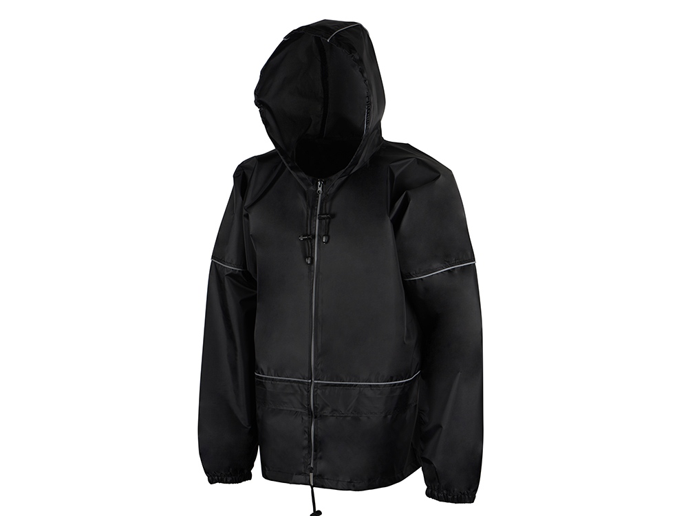 Короткий дождевик прямого силуэта с капюшоном и карманами. Вместительные накладные карманы защищены сверху клапанами, по верхней кромке которых вшит светоотражающий кант. Светоотражающие элементы также расположены на рукавах, капюшоне и молнии, что делает человека заметным даже в темное время суток. Капюшон и низ дождевика затягиваются на шнурки с фиксаторами, что позволяет отрегулировать посадку по фигуре. Манжеты дождевика — на резинке. Поставляется в чехле-мешочке на шнурке для компактного хранения. Трафаретная печать (1 цвет (цветные изделия)) на данный товар осуществляется бесплатно. Оплачивается только настройка оборудования в размере 10000 рублей на весь тираж.