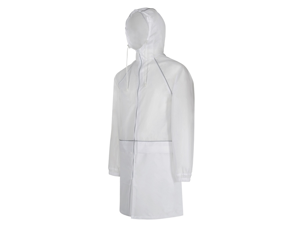 Плащ-дождевик прямого силуэта с капюшоном и рукавом реглан. Застегивается на центральную молнию со светоотражающей полосой с внутренней ветрозащитной планкой. Накладные карманами с клапанами. Двухшовный капюшон с кулиской по краю. Низ рукавов обработан манжетами с внутренней резинкой для комфортной посадке в области запястья. Верхний край клапана кармана, швы капюшона, а также регланные линии обработаны светоотражающим кантом. Поставляется в чехле-мешочке на шнурке для компактного хранения. Трафаретная печать (1 цвет (белые изделия)) на данный товар осуществляется бесплатно. Оплачивается только настройка оборудования в размере 8200 рублей на весь тираж.