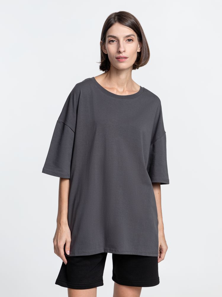 Объемная кроеная футболка с удлиненным рукавом из гребенного хлопка с эластаном не стесняет движений и создает модный расслабленный силуэт.