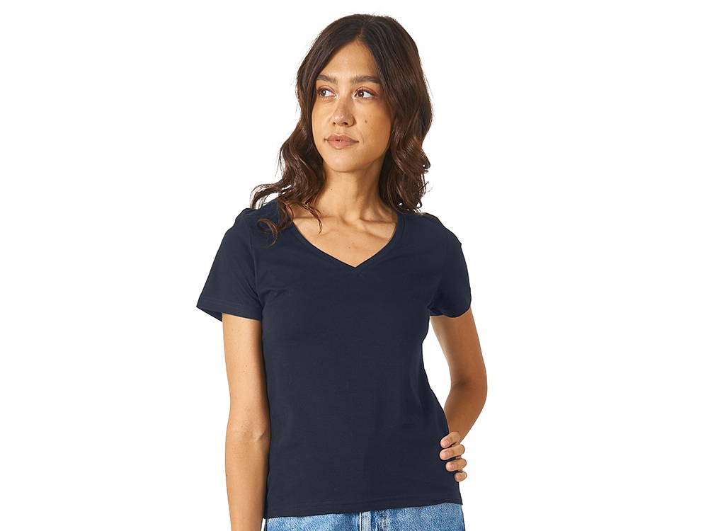 Женская футболка из натурального хлопка с элегантным V-образным вырезом. Материал отлично подходит для нанесения рекламной информации. Натуральная ткань не вызывает раздражения кожи.