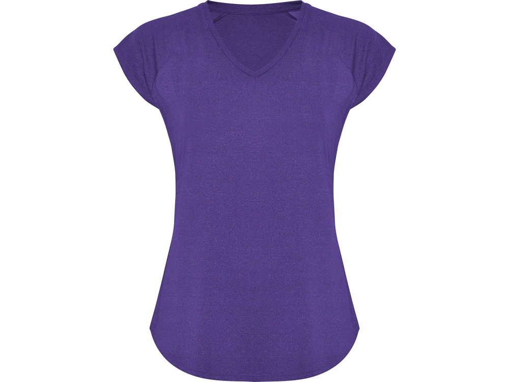 Спортивная женская футболка с коротким рукавом реглан. Вырез горловины V. Полотно из полиэстера на ощупь напоминающее хлопок. Приталенный силуэт.