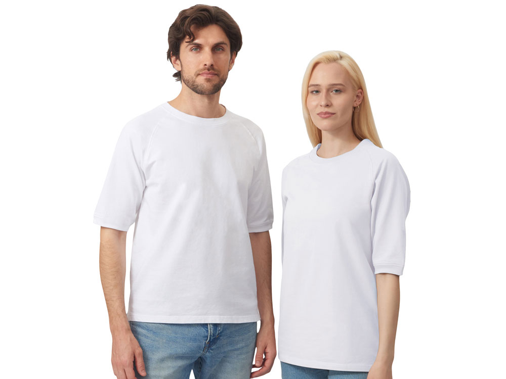 Футболка выполнена из хлопкового френч терри с петельками на изнаночной стороне. Горловина обработана рибом 2х2 и дополнительно усилена тесьмой-елочкой с внутренней стороны спинки и дополнена кокеткой по спинке для нанесения логотипа клиента. Рукав реглан продублирован рибом по низу. Разрезы в боковых швах. Гладкая поверхность полотна позволяет идеально нанести изображение. Футболка комфортного силуэта. - кокетка на внутренней стороне спинки для нанесения - комфортный силуэт - мягкое и качественное полотно френч терри Трафаретная печать (1 цвет (белые изделия)) на данный товар осуществляется бесплатно. Оплачивается только настройка оборудования в размере 7300 рублей на весь тираж.