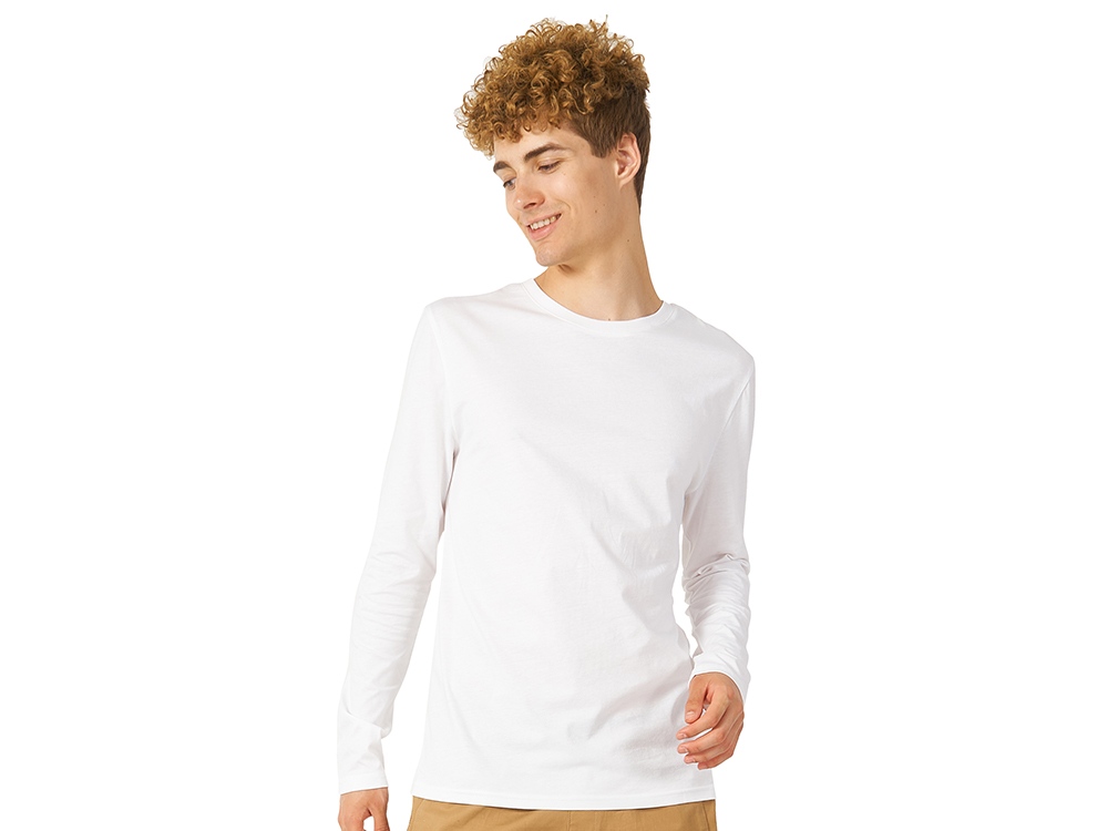 Футболка с длинным рукавом комфортной посадки с боковыми швами. Горловина обработана рибом 1х1 и тесьмой по спинке. Футболка выполнена из хлопкового джерси.