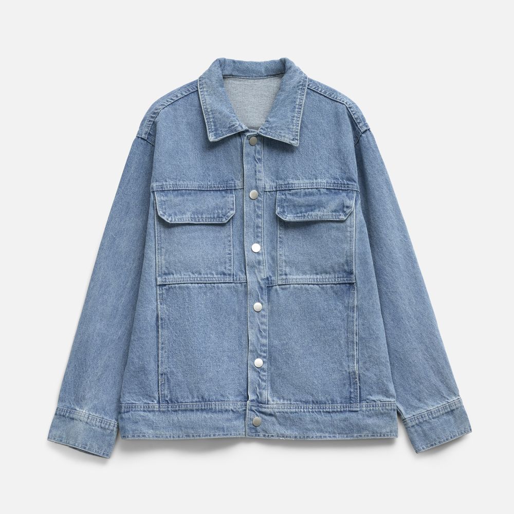 Джинсовая куртка унисекс на кнопках свободной посадки.- Два нагрудных кармана с клапанами
