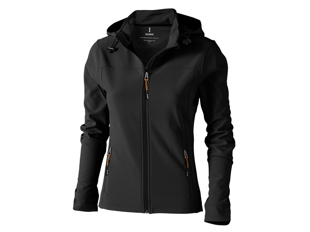 Женская куртка софтшел Langley. Стандартный покрой. Отстегивающийся капюшон на шнурках со стопперами. Обратная молния по центру и на карманах для рук. Регулируемые манжеты на липучках. Отражающий лого сзади. Водонепроницаемый 5000 мм. Дышащий 3000 мм. Ткань эластична в четырех направлениях. Ветронепроницаемая. Ремешки на собачку (второй комплект в цвете антрацит). Ткань из 90% полиэстера и 10% эластана, склеенного со 100% полиэстеровым микрофлисом. 300 г/м². Термотрансфер (1 цвет (цветные изделия)) на данный товар осуществляется бесплатно. Оплачивается только настройка оборудования в размере 10000 рублей на весь тираж.