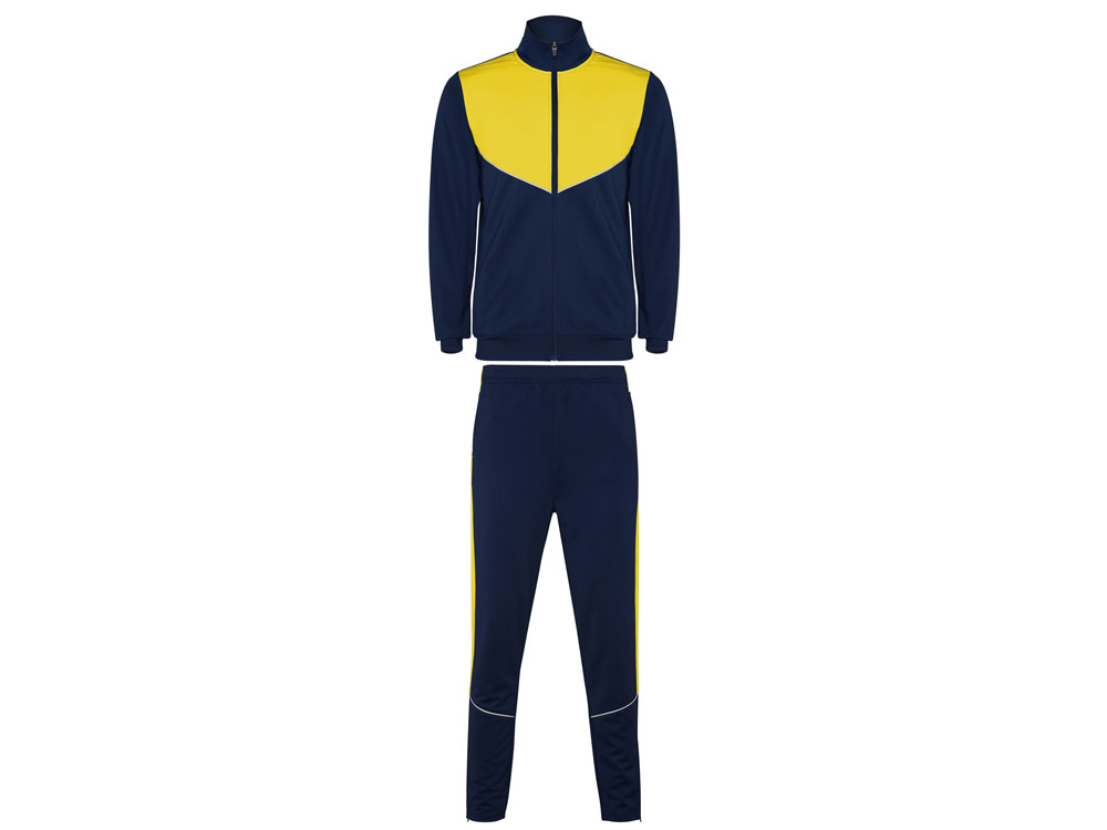 Спортивный костюм из облегченного и эластичного материала. - куртка с контрастными вставками и кантами - высокий воротник с контрастами строчками - центральная молния - боковые карманы - риб 2х2 на манжетах и низу - контрастные боковые части с кантами - молнии по низу - брюки на эластичном поясе со шнурками