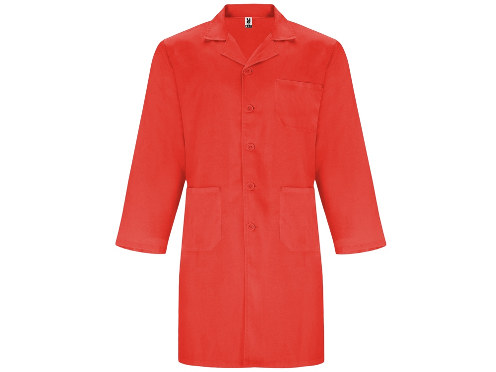 Халат для персонала с длинными рукавами. · Воротник с лацканами. · Центральная застежка на 5 пуговиц в тон. · Один нагрудный карман и два кармана по бокам. · Пояс сзади.