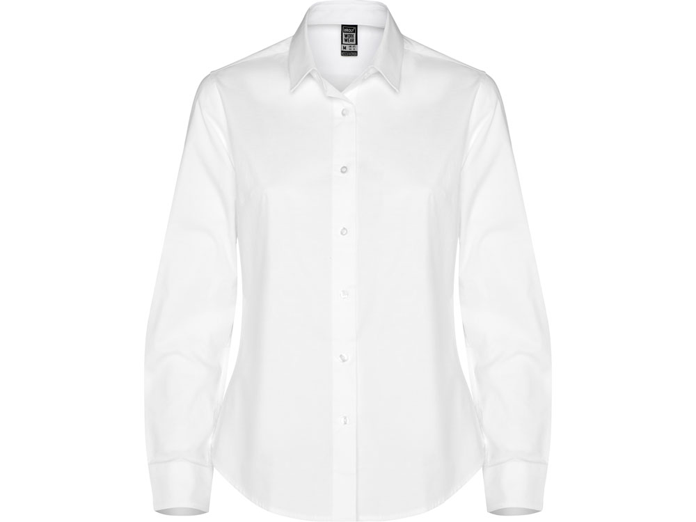 Рубашка с длинным рукавом для женщин из эластичного материала · Проклеенный воротник. · Складка на спинке. · Две пуговицы на манжетах. · Кокетка на спинке. · Закругленный низ.