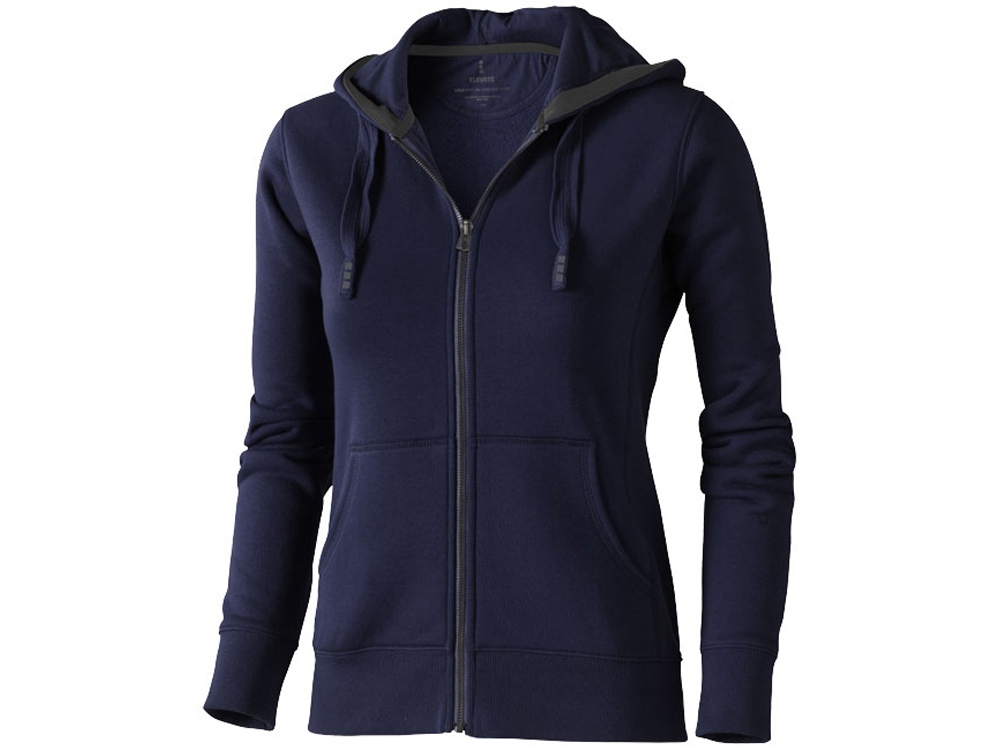 Женский свитер Arora с капюшоном и застежкой-молнией на всю длину. Стандартный покрой. Резинка 2х2 на боковых вставках, поясе и манжетах. Карман кенгуру. Мужская и женская модели с завязками на капюшоне. Подкладка внутри капюшона. Атласная лента внутри горловины. Принт лого сзади в тон изделия. Серебристые люверсы с лого. Ворсистый внутри для мягкости, тепла и комфорта. Трикотаж: 80% хлопок и 20% полиэстер, чесаная внутренняя сторона. 300 г/м². Трафаретная печать (1 цвет (цветные изделия)) на данный товар осуществляется бесплатно. Оплачивается только настройка оборудования в размере 9100 рублей на весь тираж.