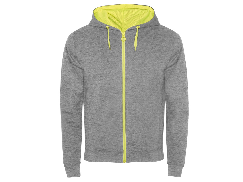 Толстовка на молнии из френч терри без начеса с деталями неонового цвета. Центральная молния с контрастным пуллером. Подкладка капюшона из микроперфорированного полиэстера контрастного неонового цвета. Шнур капюшона и айлетсы контрастного неонового цвета. Риб 1х1 на манжетах и внизу изделия. Два боковых кармана с широкой листочкой. Укрепляющая строчка внутри горловины.