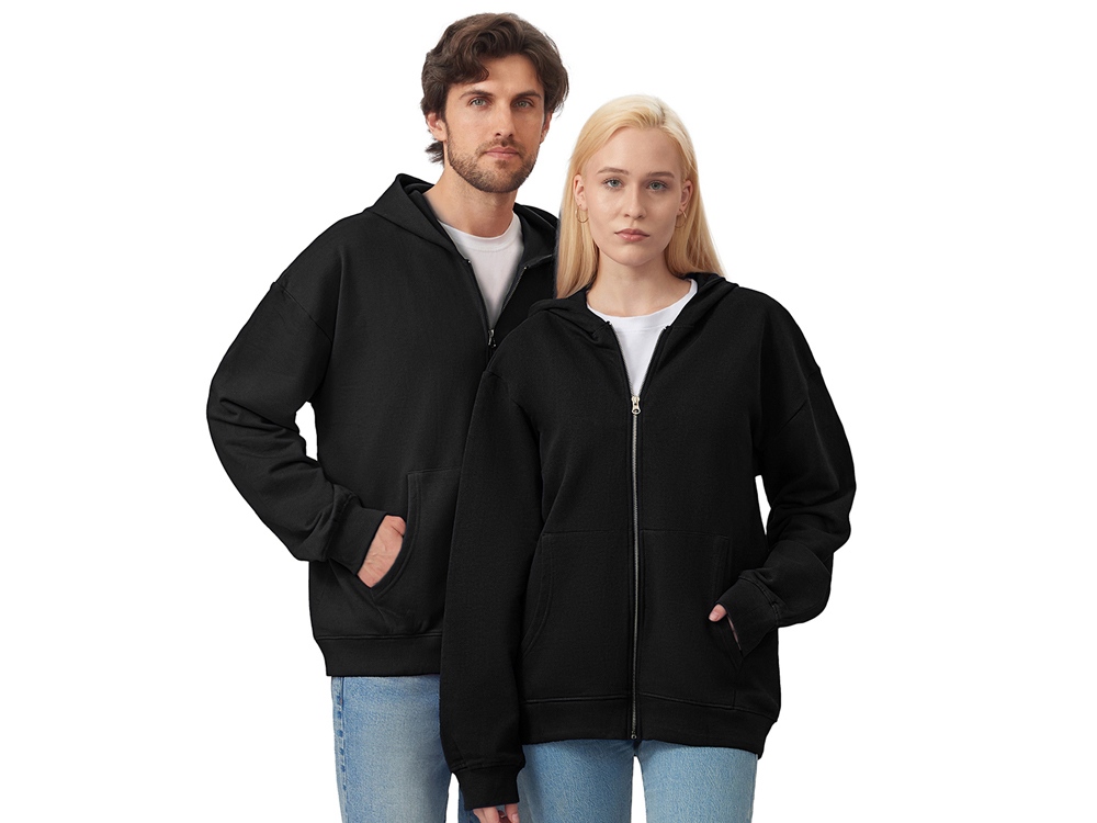 Толстовка на молнии с капюшоном. Риб 2х2 по манжетам и низу изделия. - удобный капюшон на подкладке из основного материала - посадка оверсайз - вместительный карман кенгуру - внутри на спинке кокетка - дополнительное место для нанесения лого клиента Трафаретная печать (1 цвет (цветные изделия)) на данный товар осуществляется бесплатно. Оплачивается только настройка оборудования в размере 9100 рублей на весь тираж.