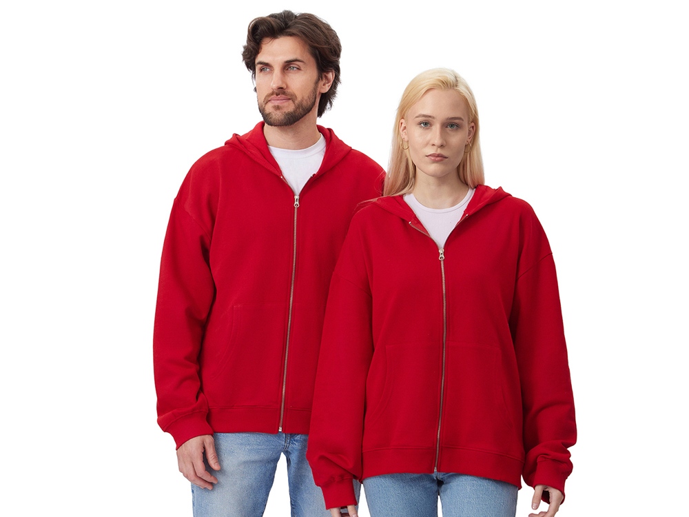 Толстовка на молнии с капюшоном. Риб 2х2 по манжетам и низу изделия. - удобный капюшон на подкладке из основного материала - посадка оверсайз - вместительный карман кенгуру - внутри на спинке кокетка - дополнительное место для нанесения лого клиента Трафаретная печать (1 цвет (цветные изделия)) на данный товар осуществляется бесплатно. Оплачивается только настройка оборудования в размере 10000 рублей на весь тираж.