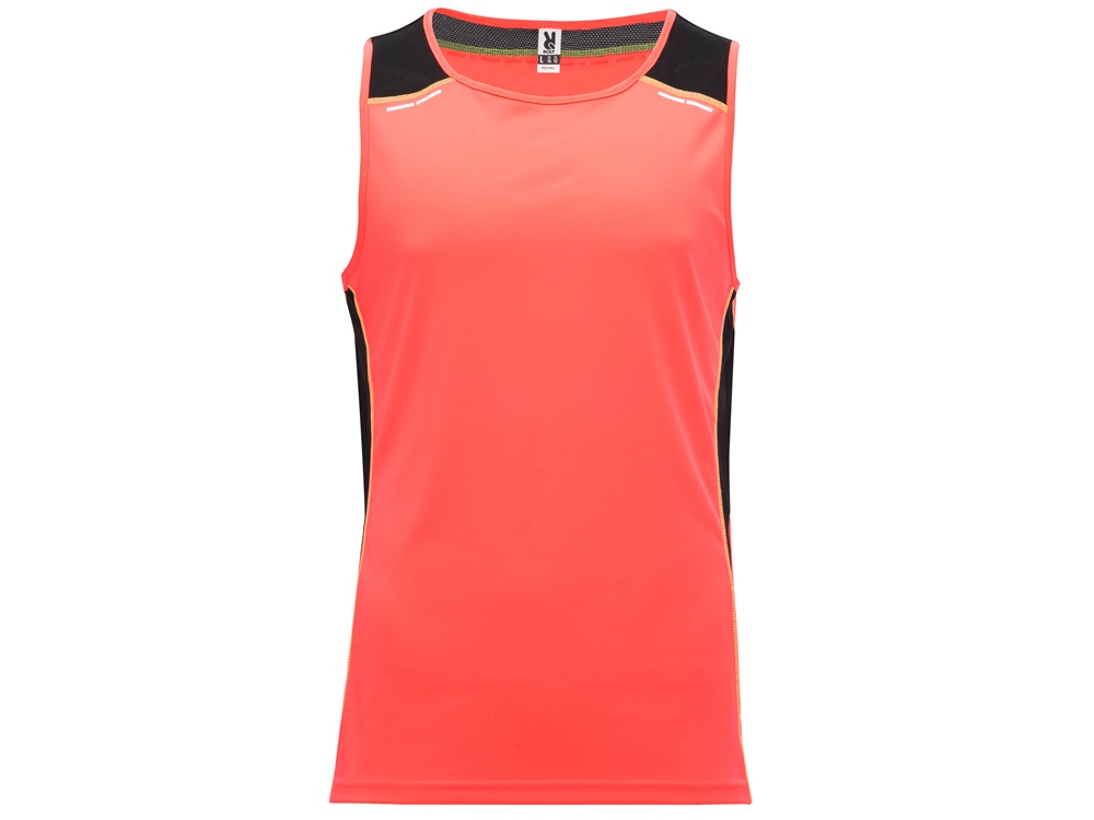 Спортивная майка со светоотражающими деталями. Круглый вырез горловины укреплен декоративной строчкой. Комбинация двух полиэстеровых полотен: основное полотно интерлок, боковые и верхние вставки из микроперфорированного полотна для повышенной воздухопроницаемости. Технологичное полотно быстро сохнет.