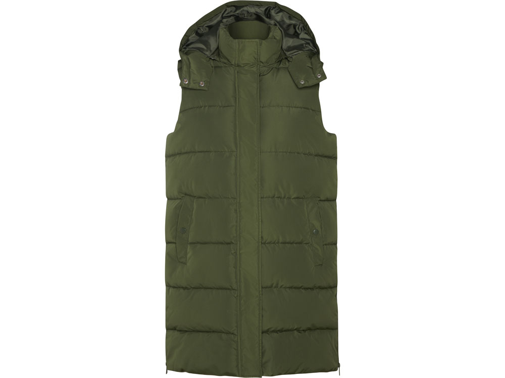 Женский стеганый жилет со съемным капюшоном. · Высокий воротник. · Передняя застежка на молнию и кнопки. · Два кармана на кнопках. · Боковые разрезы продублированы молниями. · Внутренний доступ для нанесения