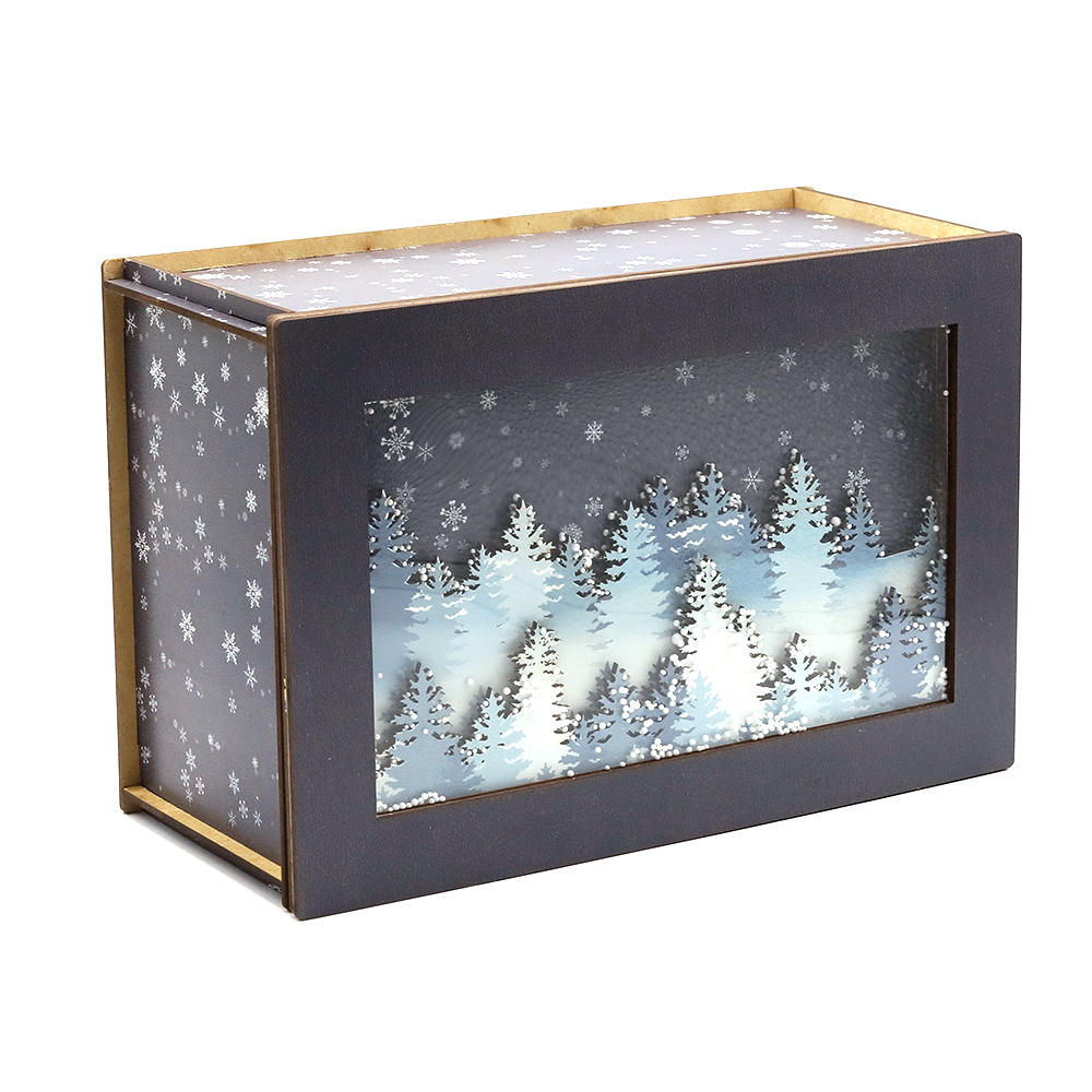 Новогодняя упаковка "Лес в снегу" — это прямоугольная деревянная коробка темного цвета, оформленная в зимнем лесном стиле с изображением снежных деревьев. Её элегантный и атмосферный дизайн создаёт ощущение зимней сказки, делая её идеальной для хранения подарков или сладостей. Отличается стильным внешним видом и добавляет праздничное настроение в новогодние торжества.