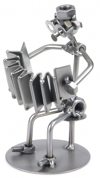 Металлические фигурки — ручная работа талантливого дизайнера из Германии. Нет такой области в жизни, что не вдохновила бы его на создание очередной металлической фигурки причудливой формы, отличительной особенностью которой является использование таких предметов, как болты, гайки, проволока, различные пластины и т. п. Необыкновенный стиль, который можно трактовать как Modern, Hi-Tech или даже Steampunk, сделали фигурки популярными во всём мире. Фигурка "Баянист-виртуоз" станет отличным подарком вашим друзьям и коллегам музыкантам.