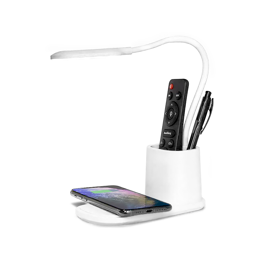 Практичная настольная лампа Tenza для использования в офисе и доме. Стильный лаконичный дизайн и гибкое поворотное регулирование лампы удобно в использовании как на офисном столе, так и прикроватной тумбе. Возможность выбирать степень яркости света несомненный плюс. Держатель для ручек дополняет функциональность. И безусловный лидер популярности – это функция беспроводной зарядки Qi. Тип лампы LED (0.5 x 20 световых диодов. Цветовая температура 3000-6000К). Беспроводная зарядка 10W. Питание: 5V/2A / 100~240V/50-60Hz. В комплекте кабель USB и инструкция. Размер в упаковке: 8,3*11*20,5 см Область зарядки смартфона поддерживает все Android/Ios устройства с функцией беспроводной зарядки. Для работы беспроводной зарядки необходимо подключать устройство к сети через адаптер.