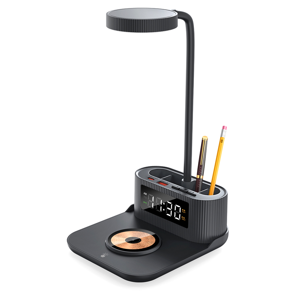 В комплект входит пластиковая накладка-наклейка с изображением на оборотной стороне черного кольца, и черной окружности со значком беспроводной зарядки. На лицевой поверхности можно нанести печать согласно конструктора из Области нанесения. Данная накладка поставляется в комплекте с лампой в ненаклеенном виде. Настольная лампа 6в1 - идеальный выбор для современной жизни и работы. Эта многофункциональная лампа сочетает в себе инновационные технологии и удобство, предлагая целый ряд полезных функций: - Беспроводная зарядка мощностью 15W: заряжайте ваши устройства легко и быстро, просто поместив их на базу лампы. - Часы и будильник: всегда будьте в курсе времени и просыпайтесь вовремя с помощью встроенных часов и будильника. - Дополнительные выходы USB-C и USB-A: подключайте и заряжайте сразу несколько устройств благодаря дополнительным портам. - Держатель для канцелярских товаров: организуйте рабочее пространство, сохраняя ручки, карандаши и другие мелочи под рукой. - 3 режима освещения: выбирайте между ярким, теплым и мягким светом, чтобы создать идеальную атмосферу для работы или отдыха. Эта настольная лампа станет отличной промопродукцией, подчеркивающей заботу о клиентах и партнерах, предлагая стильное и функциональное решение для любого рабочего пространства. Поддерживает все Android/Ios устройства с функцией беспроводной зарядки. Для работы беспроводной зарядки необходимо подключать устройство к сети через адаптер. Мощность/яркость лампы - 3 Ватт/ От 320до 480 Люмен Цветовая температура лампы: для белого света - 6000-6500K,для теплого и мягкого света - 2800-3000k.
