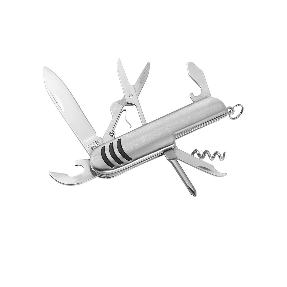 - Функции: Штопор, Нож, Пилочка, Крестовая отвертка, Ножницы, Кольцо для ключей, 2 открывашки.