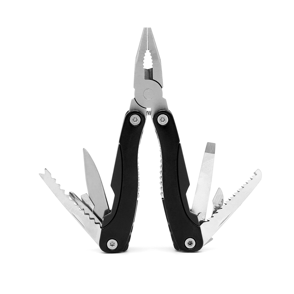 - Функции: Плоскогубцы, Кусачки, Консервный нож, Открывалка для бутылок, Средняя и маленькая плоские отвертки, Крестовая отвертка, Гладкое лезвие, Зубчатое лезвие, Пила, Напильник