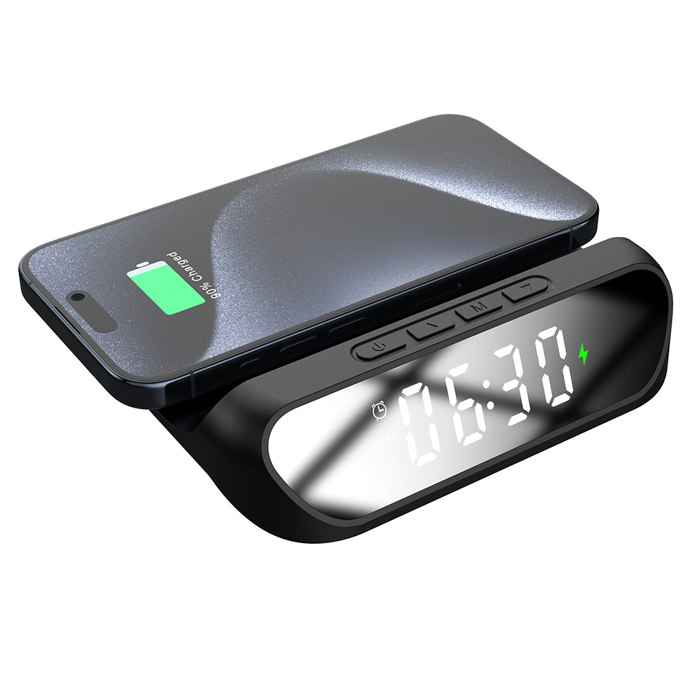 Многофункциональные часы 3в1: беспроводная зарядка 15W, часы, будильник Входное напряжение и ток:9v-1.6A/5V-2A Выходное напряжение и ток:9v-1.6A/5V-2A Мощность зарядки:15W Расстояние срабатывания зарядного:5-7MM. Для работы беспроводной зарядки необходимо подключать устройство к сети через адаптер. Область зарядки смартфона поддерживает все Android/Ios устройства с функцией беспроводной зарядки.