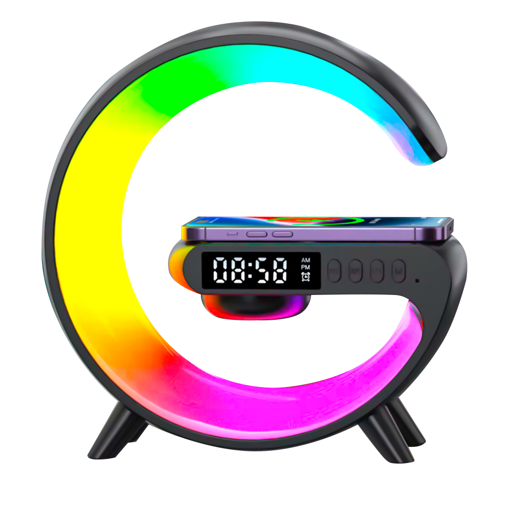 Беспроводная колонка с функцией беспроводной зарядки. Часы, будильник, RGB-подсветка, а так же защитная накладка на кнопке включения являются её особенностями. При остаточном заряде 10-20% подаётся предупреждающий сигнал. Размер: 155*55*160мм Bluetooth: v 5.2 Мощность динамика: 3W Батарея: 3.7V / 200 mAh Время работы: 2-3 Часа Время зарядки: 2,5 Часа Порт зарядки: Type-C Входное напряжение и ток: 5V/2A Беспроводное зарядное выход: 5W. Поддерживает все Android/Ios устройства с функцией беспроводной зарядки. Для работы беспроводной зарядки необходимо подключать устройство к сети через адаптер.