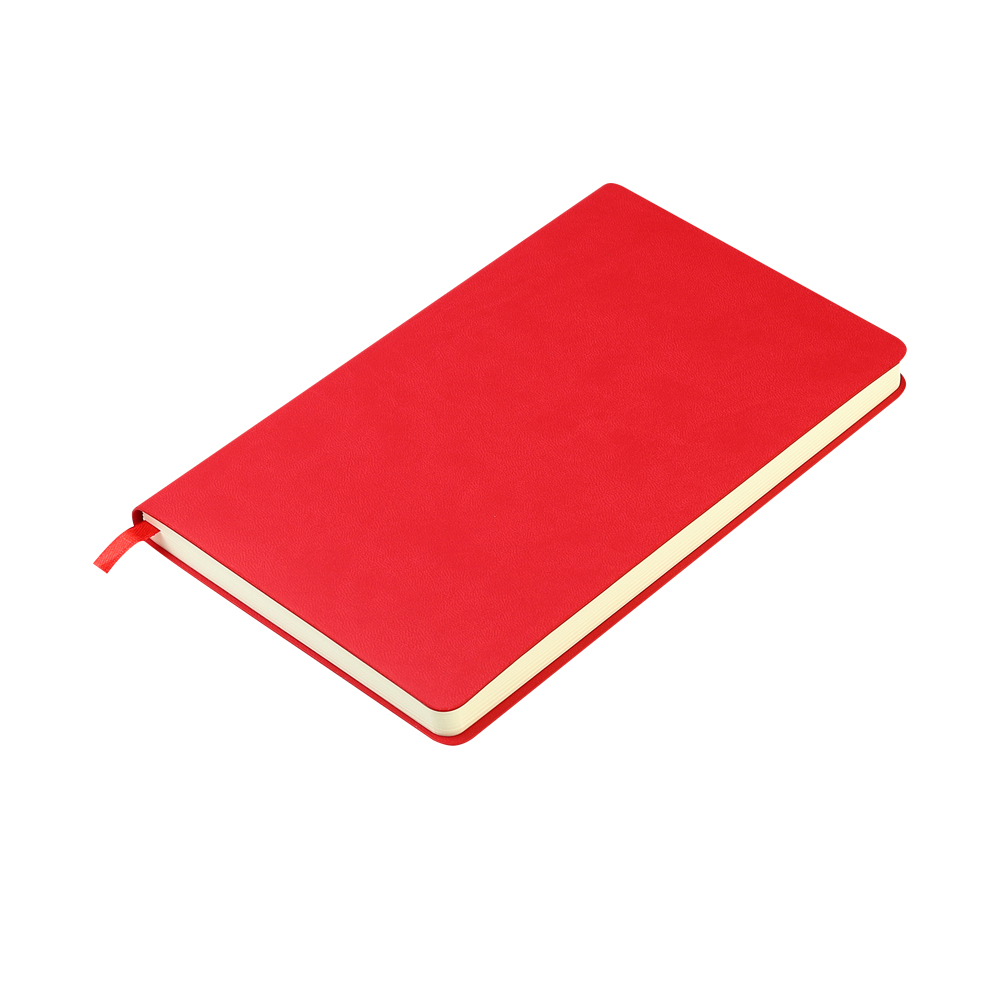 Блокнот формата А5 с мягкой обложкой из PU-материала, имеющего текстуру, имитирующую поверхность натуральной кожи; с текстильной закладкой в цвет блокнота, 256 страниц, плотность 70г/м, страницы с черными линиями. Цвет по PANTONE® (максимально приближен): 186C.