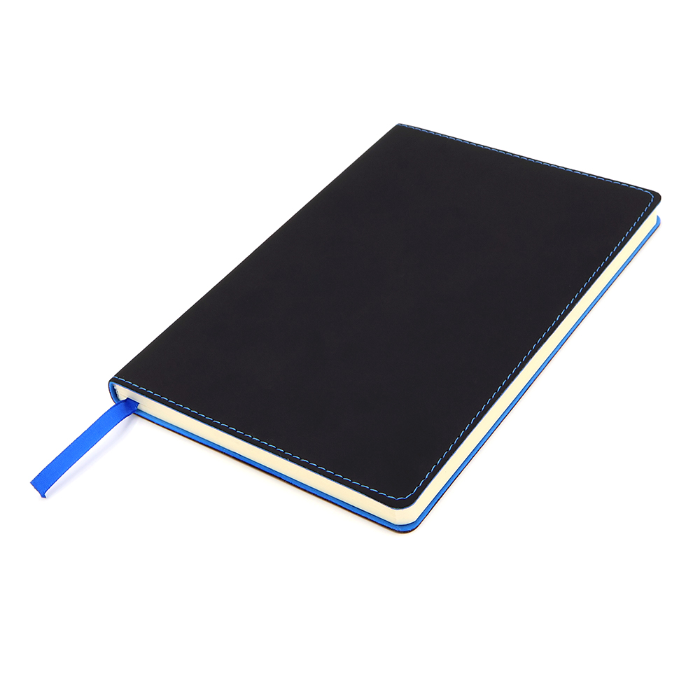 Блонот формата А5 в мягкой обложке из искусственной кожи. Материал обложки - термополиуретан. Основной цвет - чёрный; строчка по периметру, внутенний край и ляссе - зелёного цвета. Размеры: 214*144мм, 80 листов, разлинееные страницы, бумага плотностью 80г/м2.