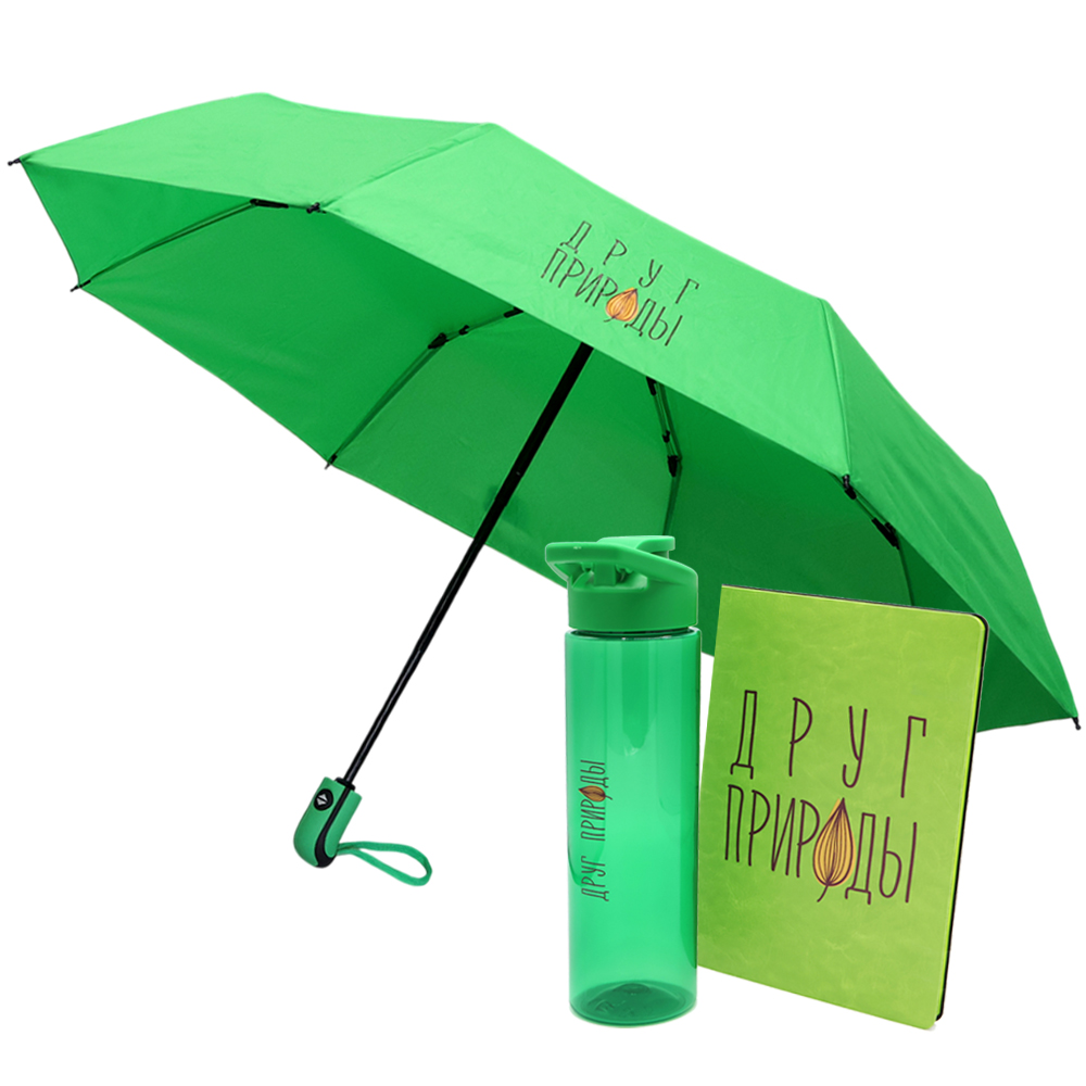 «ДРУГ ПРИРОДЫ» — этот набор станет вашим шагом в большом деле. Решение глобальных вопросов всегда начинается с маленьких шажков, которые может совершить каждый из нас. Сортировка мусора, уменьшение потребления пластика, экономия воды. В современном мире ежегодно увеличивается количество людей, которые всерьез задумываются об экологии. Стать другом природы не сложно! Состав набора: 1. Пластиковая бутылка Ronny, зеленая (артикул 14027.04) - 1 шт. 2. Блокнот A5 Beam в мягком переплёте, зеленый (артикул 51005.04) - 1 шт. 3. Автоматический противоштормовой зонт Dakota, зеленый (артикул 8017.04) - 1 шт.