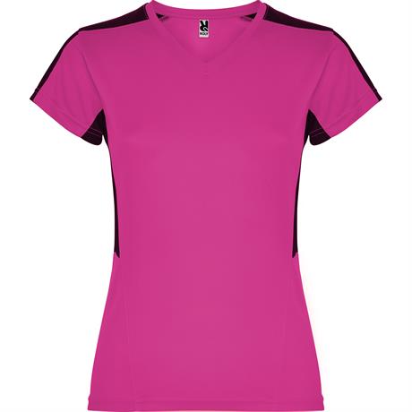 Женская Спортивная футболка с короткими рукавами. 1. Горловина с V-образным вырезом. 2. Сочетание двух тканей с полиэстера на плечах и боках. 3. Основная ткань — ткань bird's eye, и 3D-сетчатая дышащая ткань — на плечах и боковых вставках. 4. Ткань, под