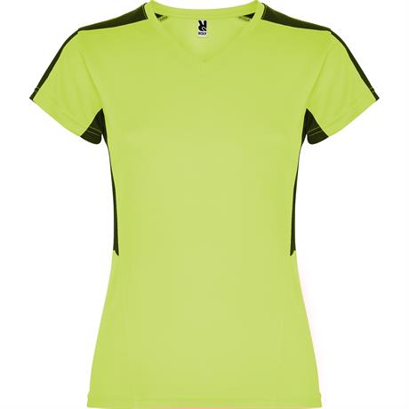 Женская Спортивная футболка с короткими рукавами. 1. Горловина с V-образным вырезом. 2. Сочетание двух тканей с полиэстера на плечах и боках. 3. Основная ткань — ткань bird's eye, и 3D-сетчатая дышащая ткань — на плечах и боковых вставках. 4. Ткань, под