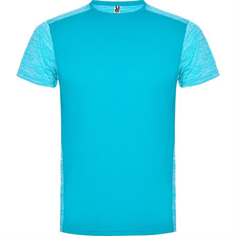 Спортивная футболка с короткими рукавами. 1. Круглая горловина. 2. Сочетание двух тканей с полиэстера на спине, плечах и рукавах. 3. Основная ткань спереди — ткань bird's eye, и ткань space dye — сзади. 4. Спинка немного длиннее переда. Быстросохнущая дыш