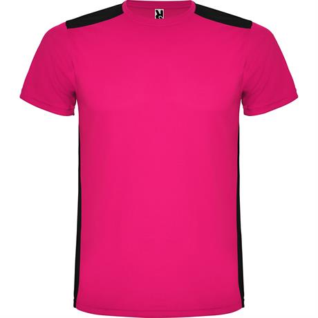Спортивная футболка с короткими рукавами. 1. Круглая горловина. 2. Сочетание двух тканей с полиэстера на плечах и спине. 3. Основная ткань спереди — ткань bird's eye, и 3D-сетчатая дышащая ткань — сзади. 4. Ткань, подготовлена для впитывания влаги. 5. Д