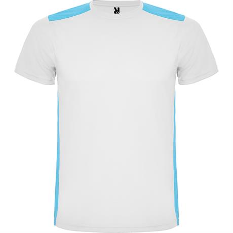Спортивная футболка с короткими рукавами. 1. Круглая горловина. 2. Сочетание двух тканей с полиэстера на плечах и спине. 3. Основная ткань спереди — ткань bird's eye, и 3D-сетчатая дышащая ткань — сзади. 4. Ткань, подготовлена для впитывания влаги. 5. Д