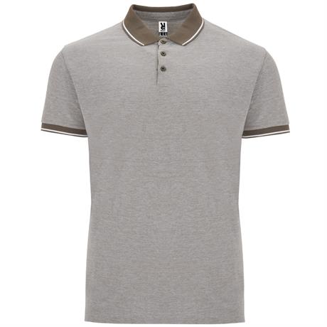 Футболка поло меланжевого цвета с короткими рукавами. Воротник и манжеты рукавов однотонного цвета в рубчик 1 x 1 с контрастной декоративной полосой. Внутренняя планка с декоративной контрастной лентой на три пуговицы. Вырез внизу по бокам с усиленными шв