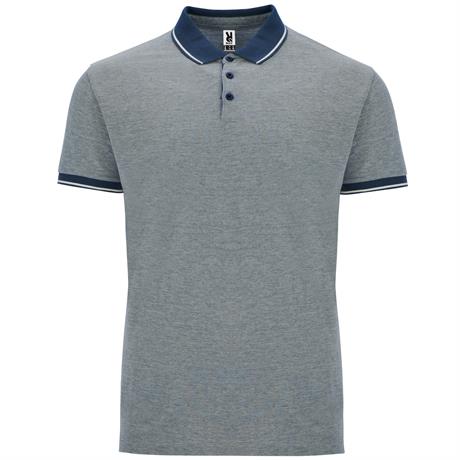 Футболка поло меланжевого цвета с короткими рукавами. Воротник и манжеты рукавов однотонного цвета в рубчик 1 x 1 с контрастной декоративной полосой. Внутренняя планка с декоративной контрастной лентой на три пуговицы. Вырез внизу по бокам с усиленными шв