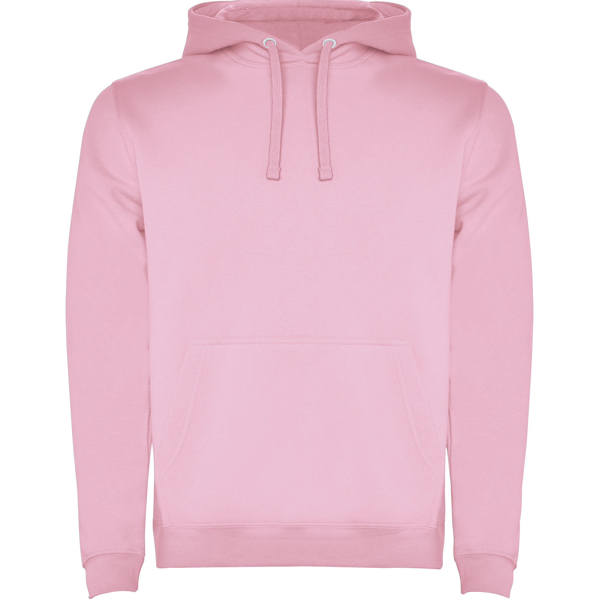 Однотонная или двухцветная толстовка с двухслойным капюшоном, регулируемым шнурком и карманом-кенгуру. Манжеты и нижний край выполнены из эластичной резинки 1x1.