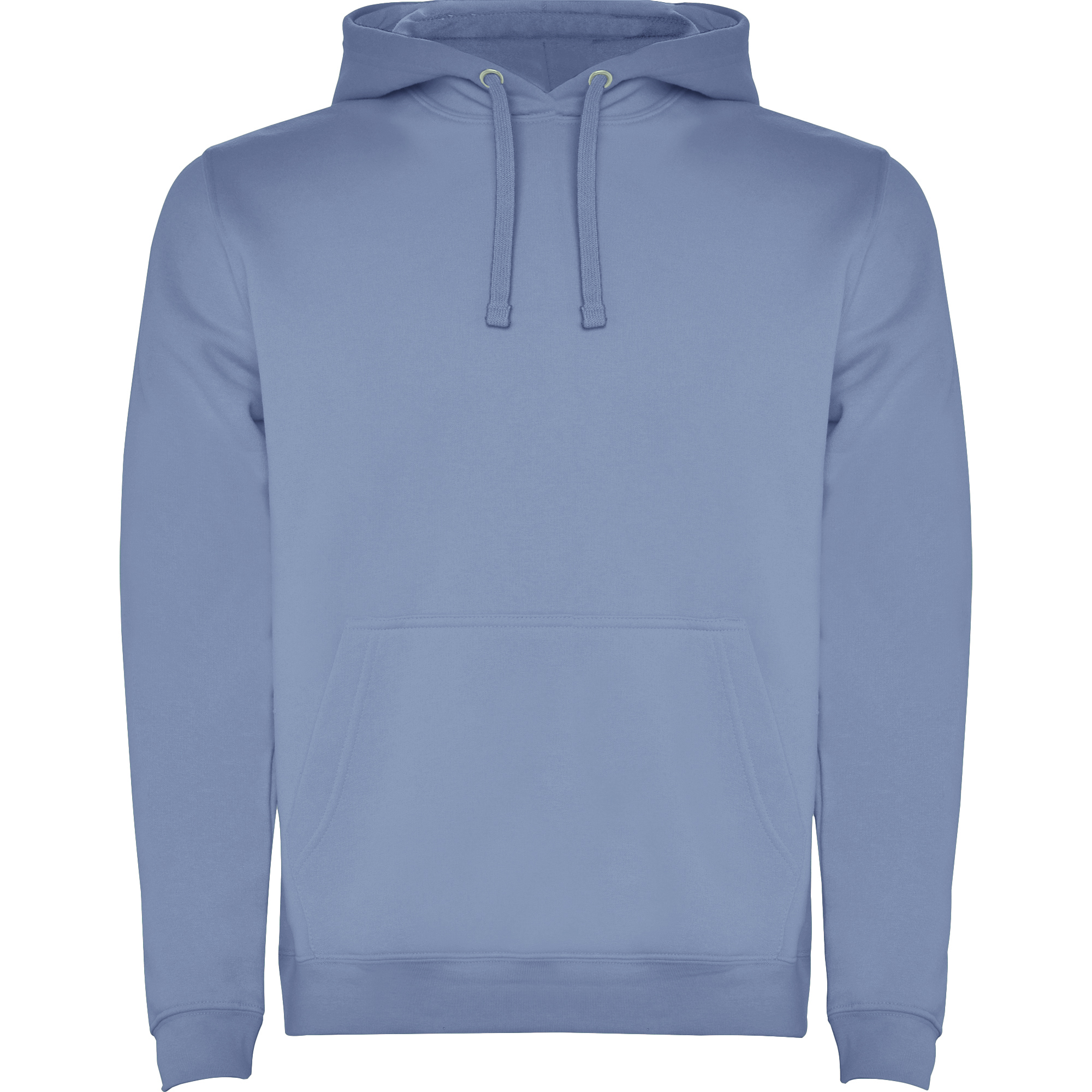 Однотонная или двухцветная толстовка с двухслойным капюшоном, регулируемым шнурком и карманом-кенгуру. Манжеты и нижний край выполнены из эластичной резинки 1x1.