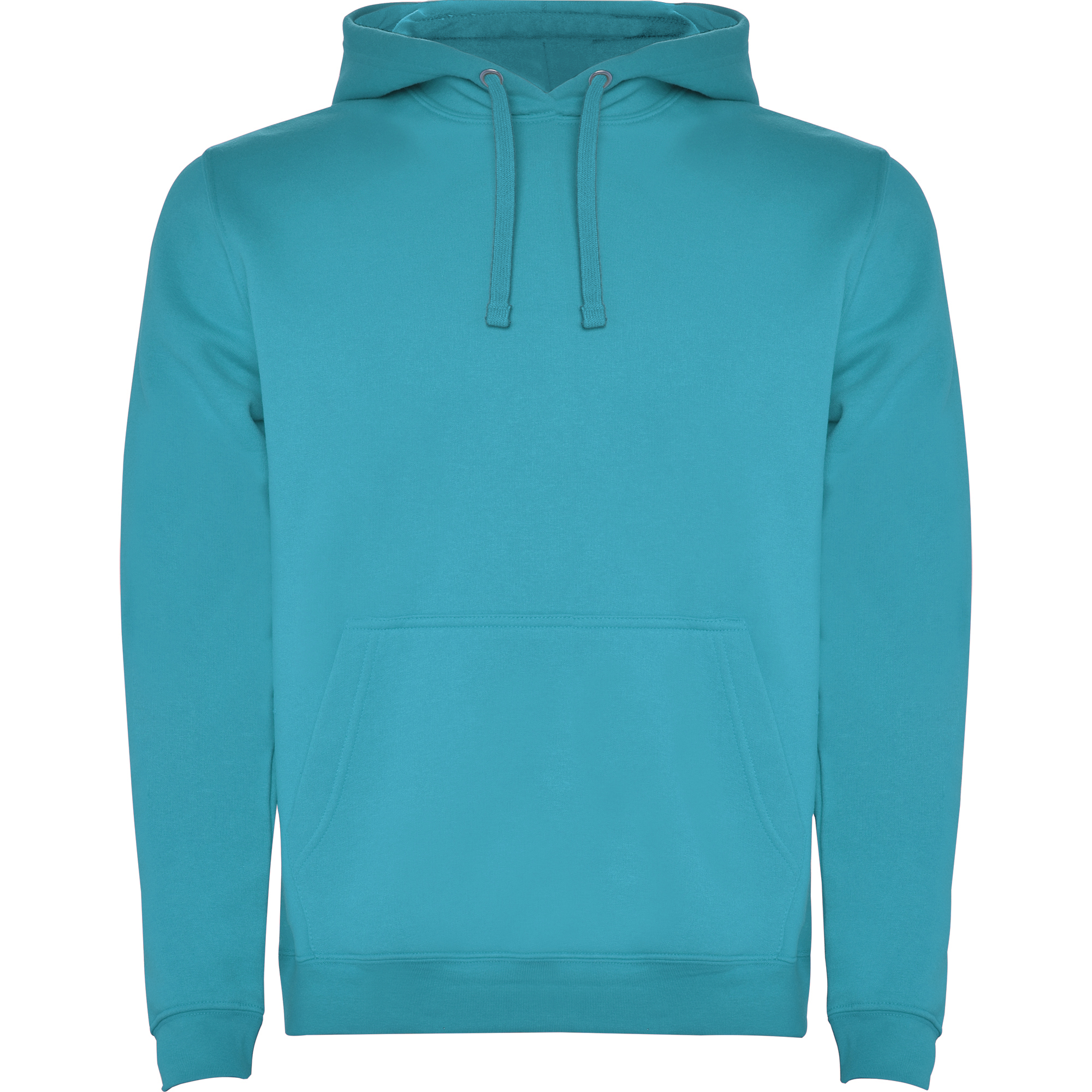 Однотонная или двухцветная толстовка с двухслойным капюшоном, регулируемым шнурком и карманом-кенгуру. Манжеты и нижний край выполнены из эластичной резинки 1x1.