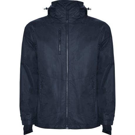 Куртка («ветровка») с очень прочной ткани с переплетенной текстурой. 1. Молния спереди с защитой для подбородка. 2. Съемный капюшон. 3. Внутренние манжеты с отверстием для большого пальца руки. 4. Низ с внутренней стороны и капюшон с регуляторами. 5. Тр