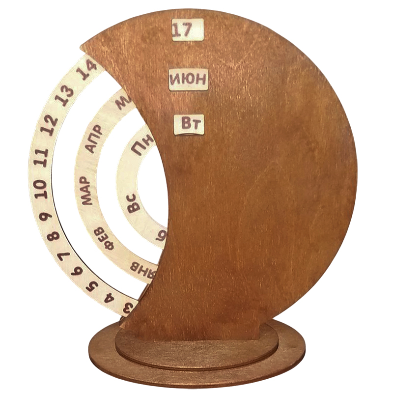 Стильный,экологичныйвечный календарь TimeLore станет актуальным подарком на любой случай. Характеристики: • Фанера: 1,5мм внутренние круги, и 4 мм фанера в два слоя, лицевая часть. • Материал внутренних кругов - АБС пластик золото. • Водный декоративно-защитный состав - HOLZ LAZUR AQUA.