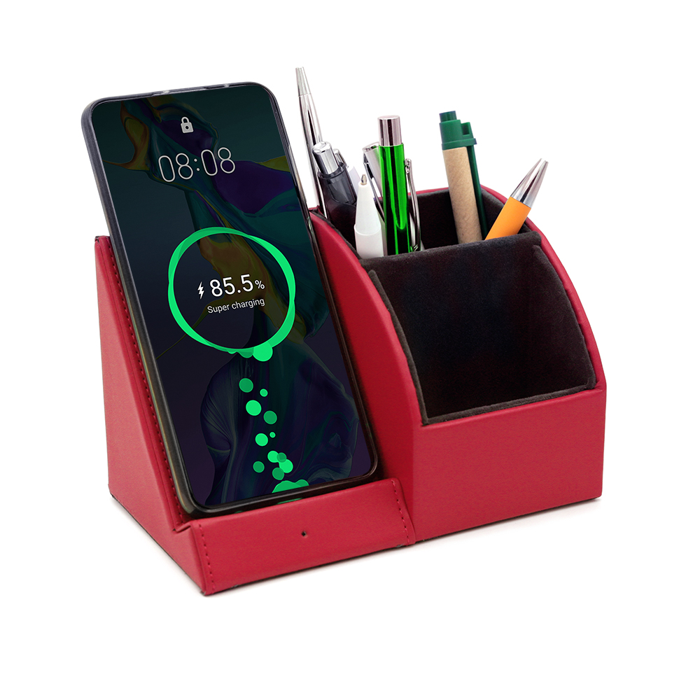 Настольный органайзер Prestige c беспроводной зарядкой и световым индикатором. Удобный инструмент для наведения порядка на рабочем месте. Цвет по PANTONE® (максимально приближен): 201C.Вход: 9V/1.67A/5V/2A USB 2.0. Выход: Беспроводная зарядка 10W. В комплекте кабель USB и инструкция. Поддерживает все Android/Ios устройства с функцией беспроводной зарядки. Для работы беспроводной зарядки необходимо подключать устройство к сети через адаптер.